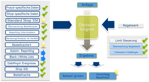 Vorliegende Zahlungs- und Warenkorb-informationen, in Kombination mit Bonitätsscores, ermöglichen Ihnen eine dynamische Limitentwicklung zur risiko- und potentialorientierten Kundensteuerung.